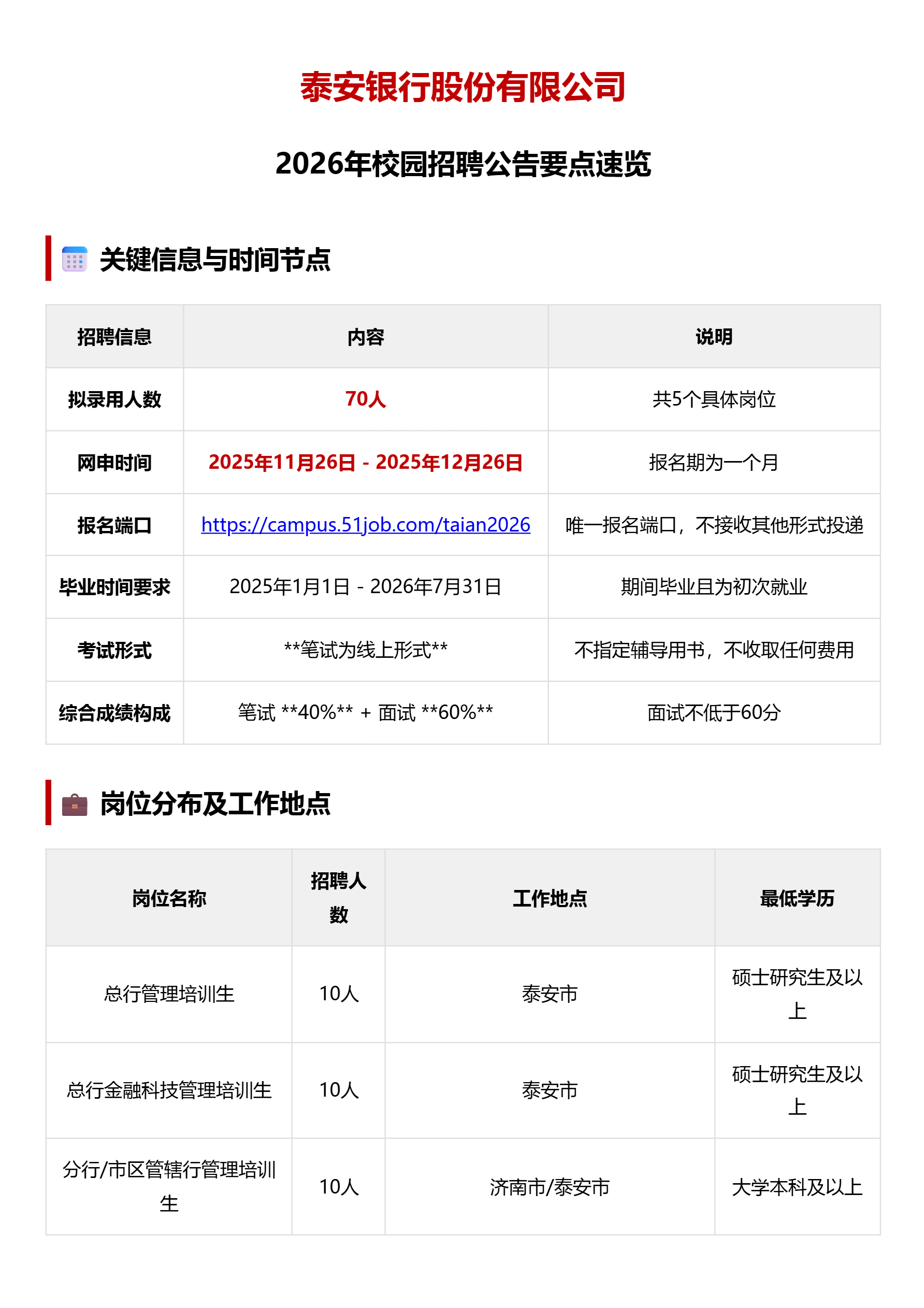 山东的uu们,别光盯着六大行卷了!👀 刚刚扒完泰安银行2026年校园招聘的公告,发现这简直是今年秋招末班车的“神仙捡漏”机会!💎 尤其是想回济南、泰安发展的宝子们,这个“六险两金”的offer必须冲!